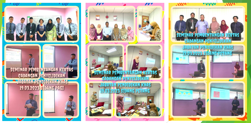 Seminar Pembentangan Kertas Cadangan Penyelidikan dalam Pendiidkan anjuran Jabatan Pendidikan Khas telah diadakan pada 19 – 22 Mac 2023 di Pusat Sumber IPG Kampus Darulaman melibatkan seramai 50 orang pelajar PISMP ambilan Jun 2020 dan 13 orang panel dari Jabatan Pendidikan Khas, Jabatan Ilmu Pendidikan dan Jabatan Perancangan Penyelidikan dan Inovasi. Seminar pembentangan ini diadakan bagi memenuhi pra syarat bagi Kursus Asas Penyelidikan Dalam Pendidikan (PKUK 3143). Tahniah kepada semua para pembentang kerana berjaya melaksanakan pembentangan kajian mereka. Ribuan terima kasih juga diucapkan oleh semua panel yang terlibat melancarkan seminar ini.