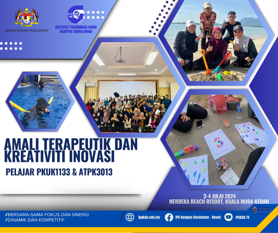 Aktiviti Amali Terapeutik dan Kreativiti Inovasi telah dijalankan di Merdeka Beach Resort pada 3 hingga 4 Julai 2024. Perjalanan program ini bermula pada jam 7.30 pagi daripada IPG Kampus Darulaman dan tiba di Merdeka Beach Resort pada jam 10.30 pagi.