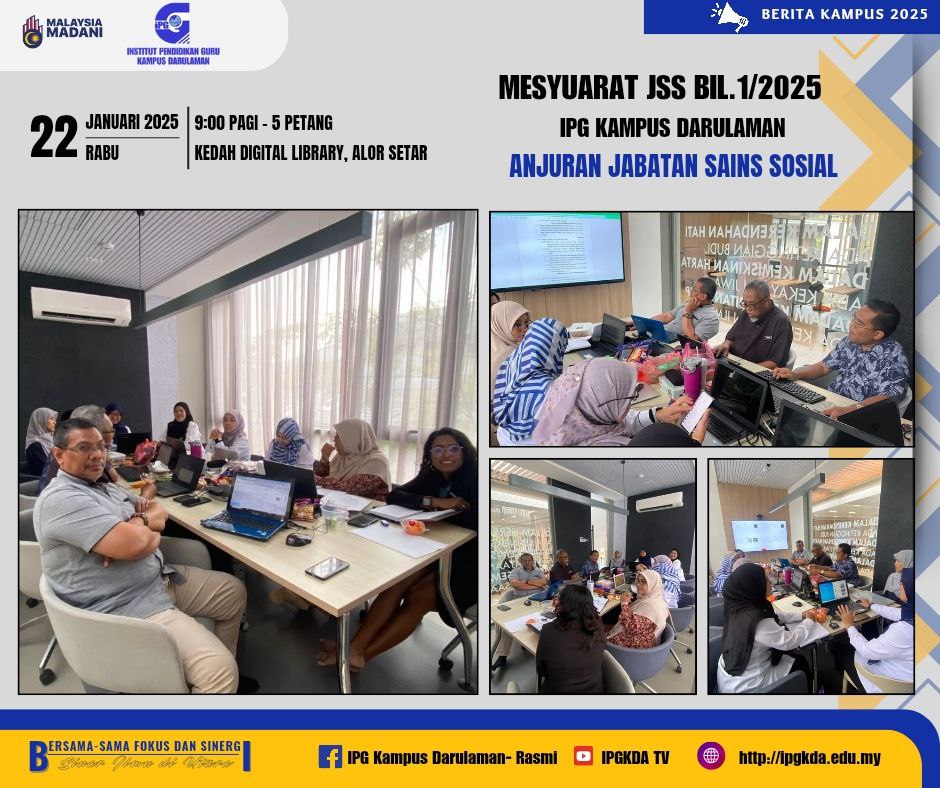 Mesyuarat Jabatan Sains Sosial kali pertama bagi tahun 2025 telah diadakan di Perpustakaan Digital Kedah bersamaan hari Rabu, 22 Januari 2025. Seramai 12 orang pensyarah JSS terlibat dalam mesyuarat tersebut. Mesyuarat ini telah dipengerusikan oleh Dr. Hjh Khalijah binti Ahmad selaku Ketua Jabatan Sains Sosial yang baru bagi tahun 2025. Mesyuarat ini diadakan bagi menyediakan para pensyarah JSS untuk Semester 2 (Sesi PdP 2024/2025).